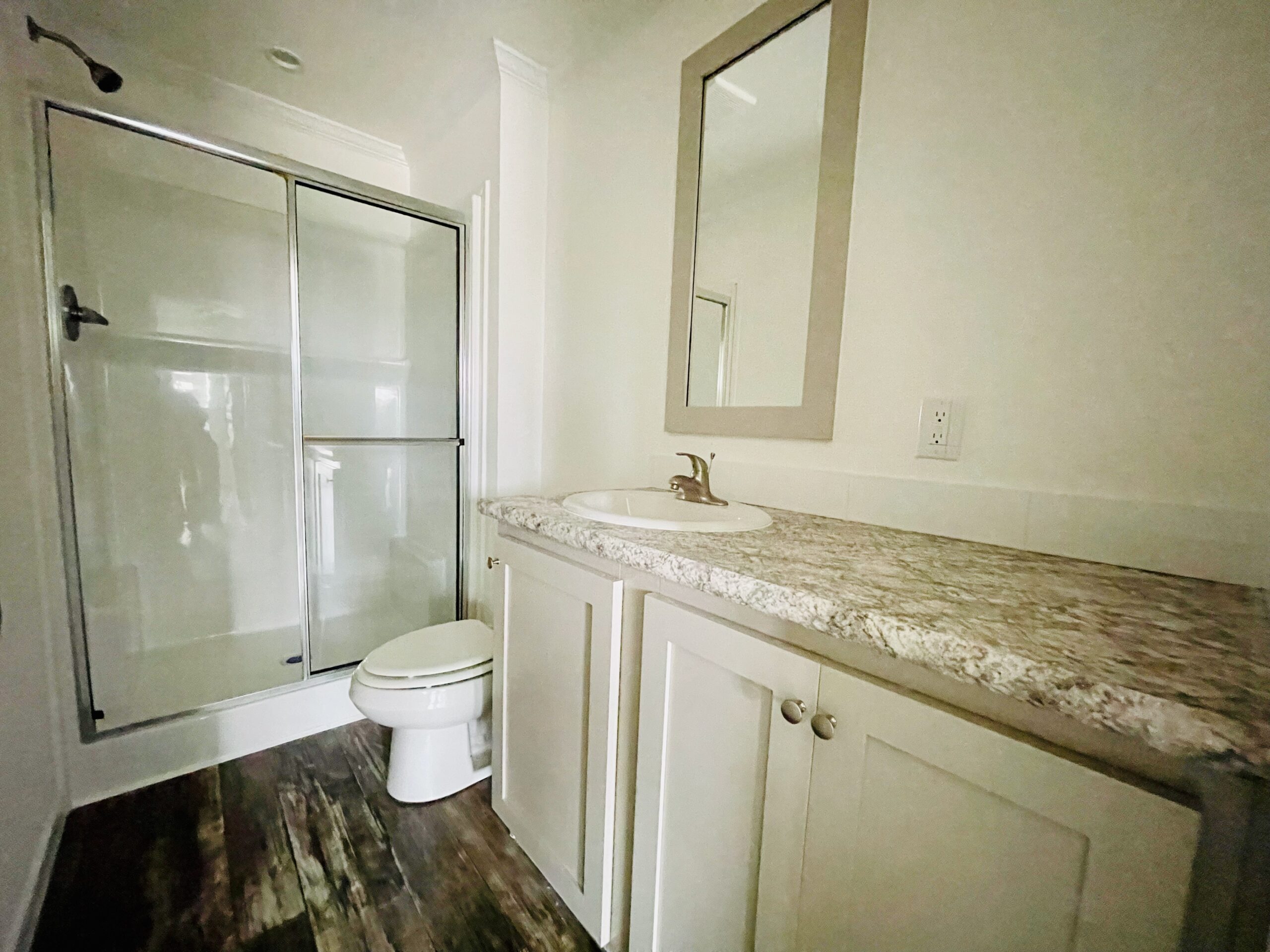 - 1-Pc 48″ fiberglass shower w/shower door (per print)