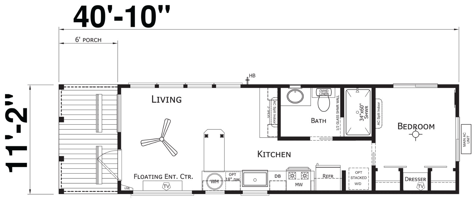 The Tiffany is fully functional with a 40A quick disconnect for A/C, stackable 24” washer and dryer, LED ceiling fans, and an efficient layout for modern living. Every detail is designed for comfort, efficiency, and small-space convenience.